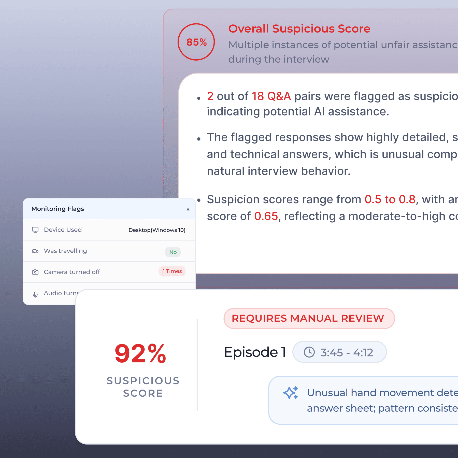Warns you about interview fraud as the session happens. Gives clear signals on which actions are suspicious with exact proof of deception.