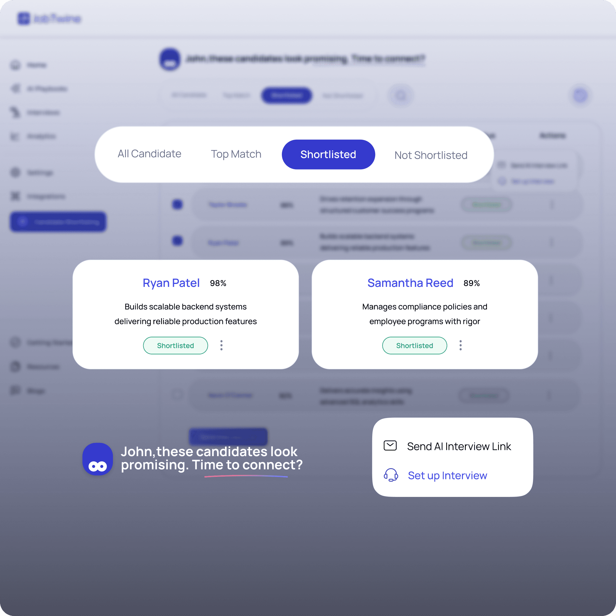 Clone of your best recruiter: Screening, interviewing, and bias-free shortlisting 24×7, so your team can focus on the human side of hiring.